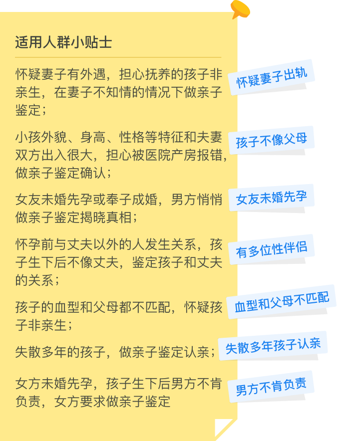 匿名亲子检测,是指委托人只想知道自己和孩子的亲子关系以供自己参考的准确结果,而并不打算把鉴定结果作为证据提供给司法机构的DNA亲子检测。
